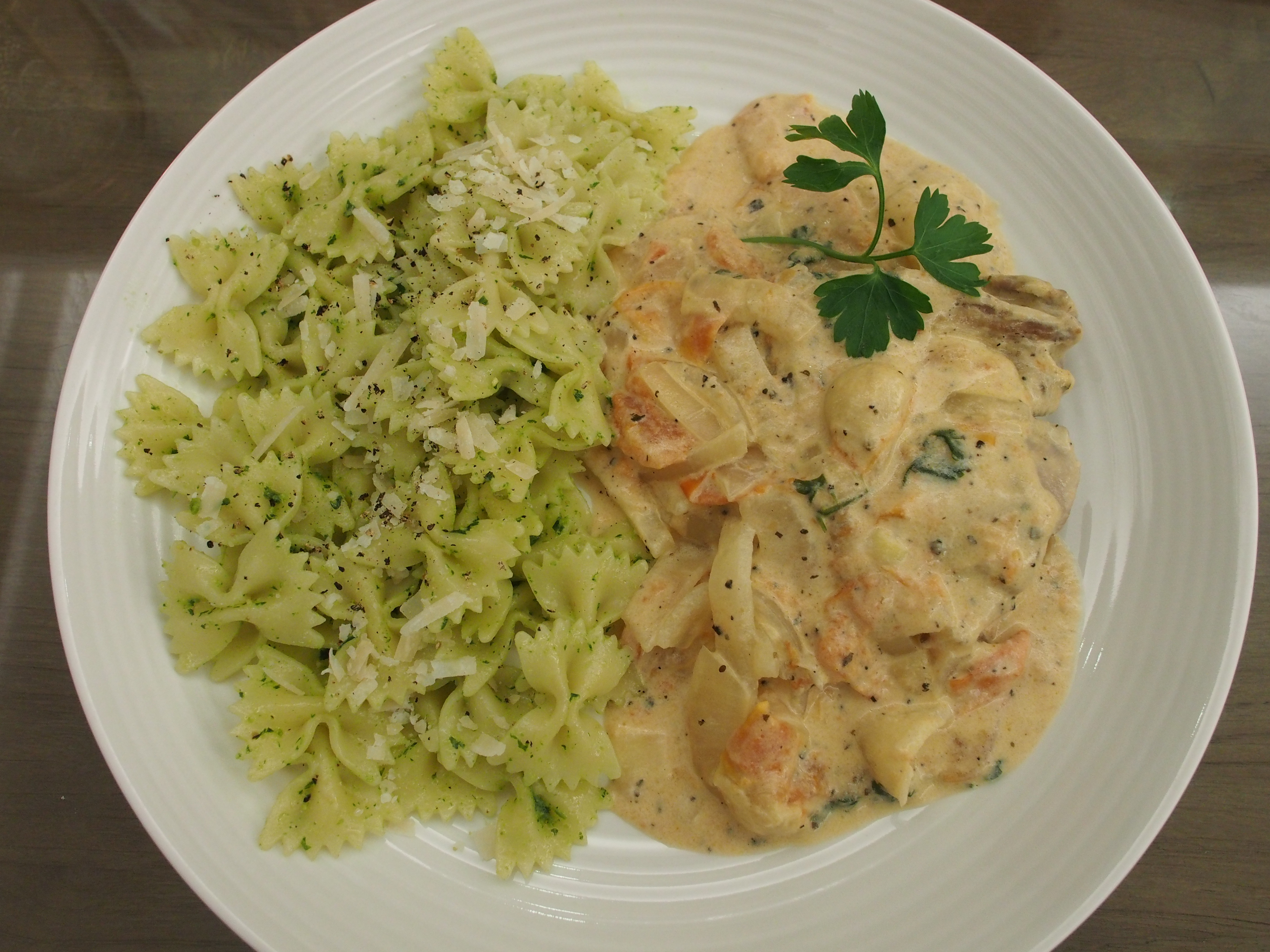 Garnish with fresh herbs and plate up with a side of your liking. In the first picture, made a pesto bow tie pasta- the basil and cheese go really well with this cream sauce. Alternatively, you can make this into a pasta sauce, as I have done in the second picture. In the third picture, I’ve pan fried the chicken with its skin and sliced potatoes.Β