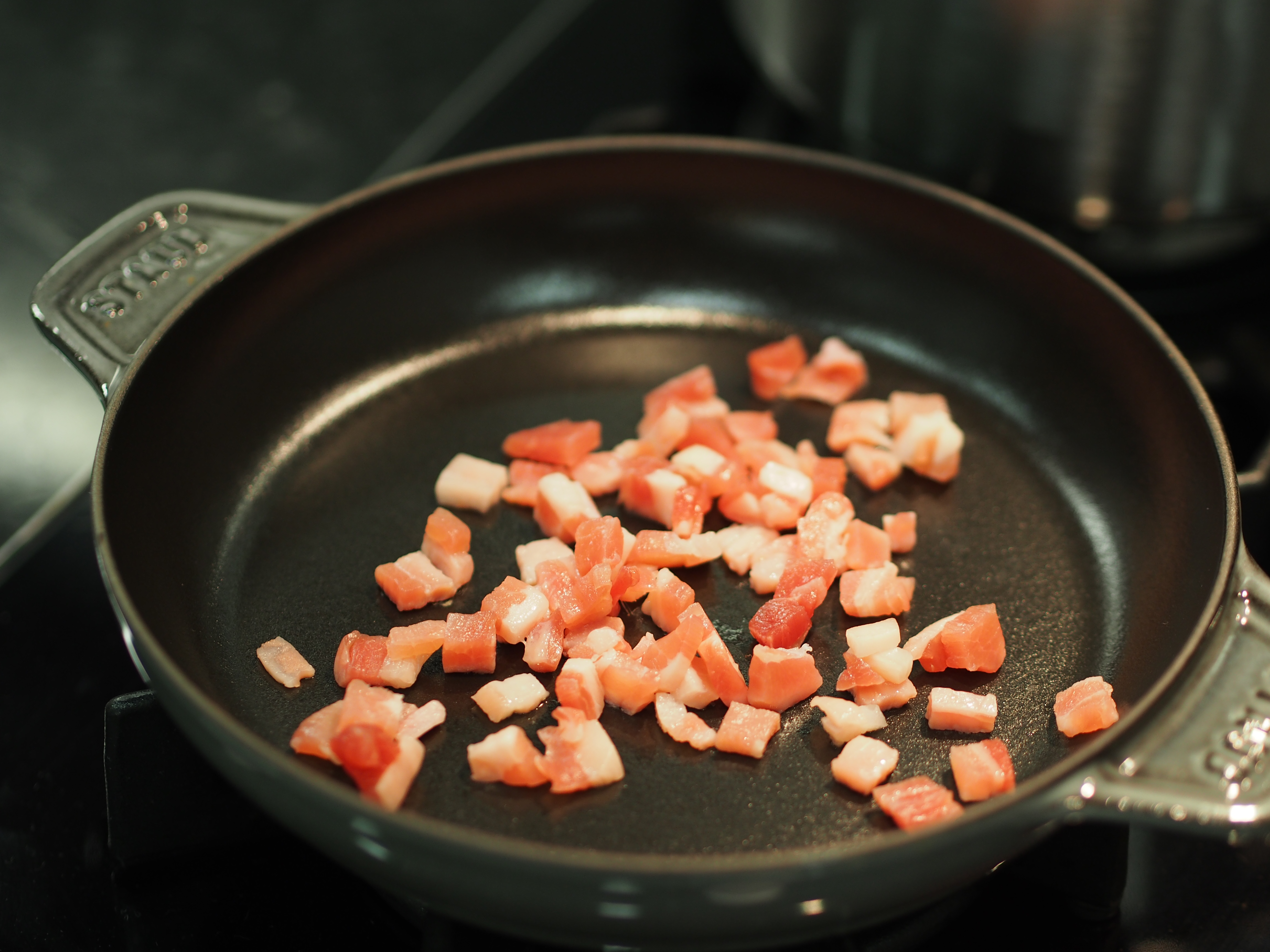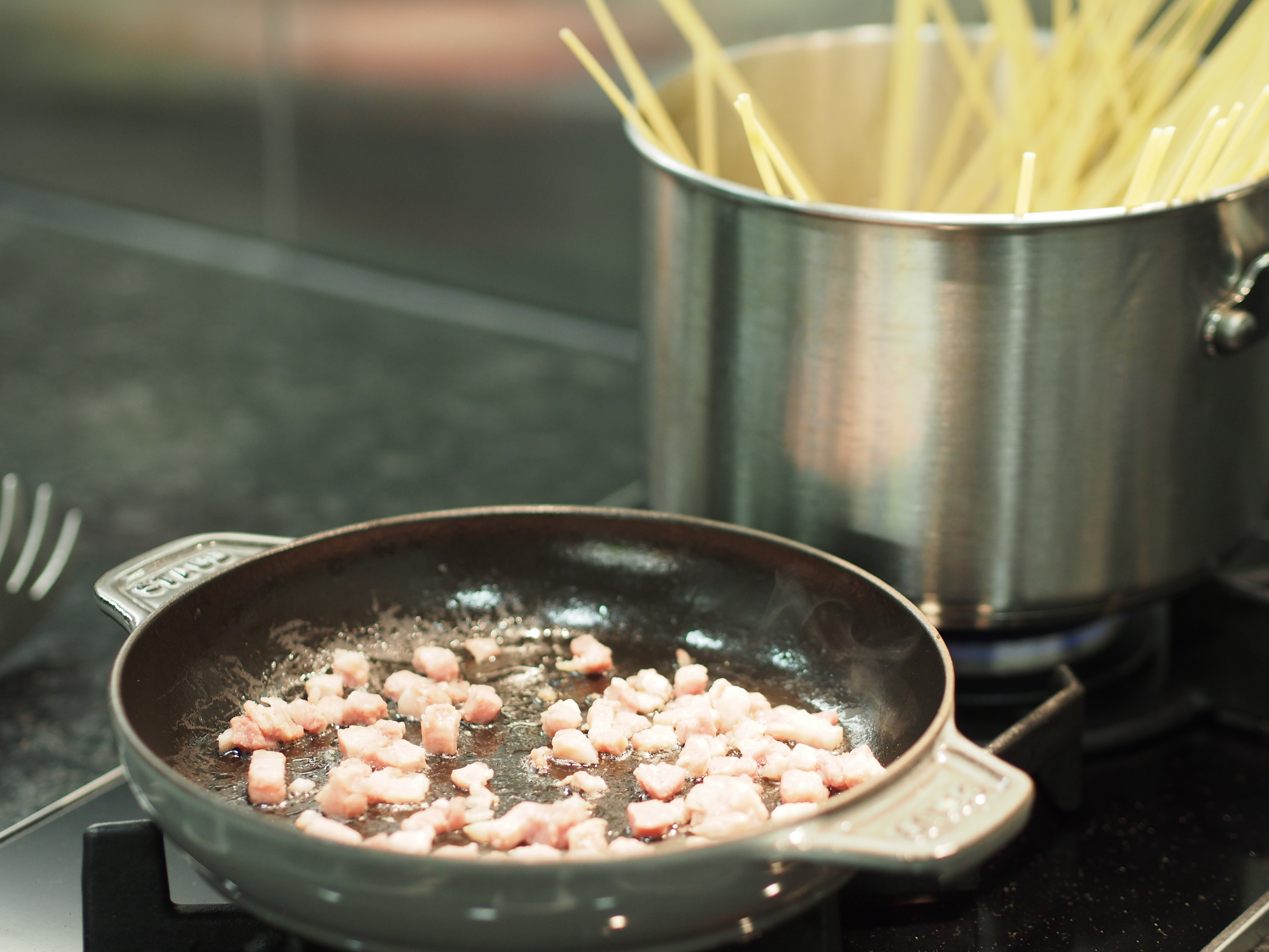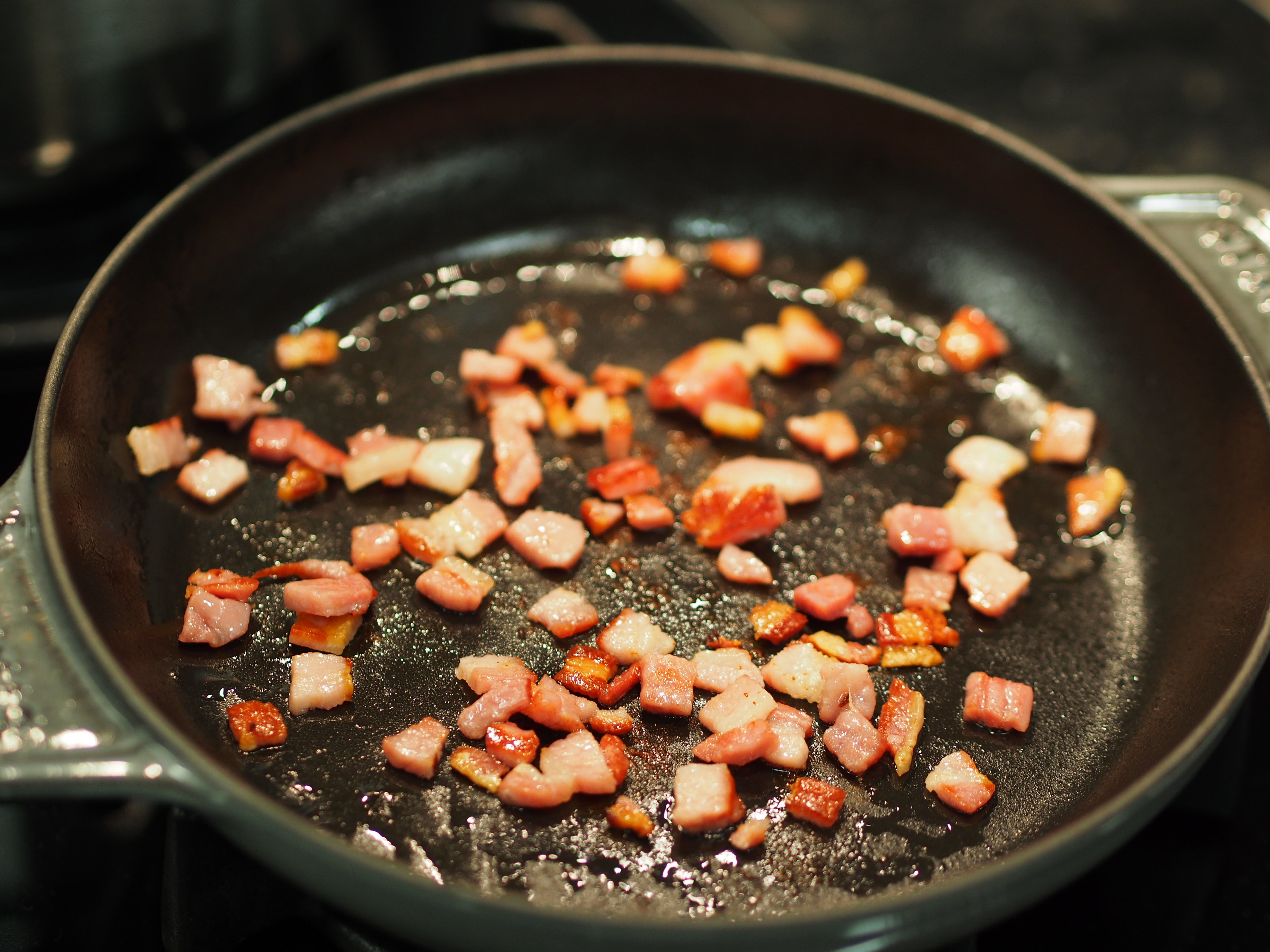 2. Heat up your pan on med-high heat and saute the pancetta until they sizzle, brown, and release oil into the pan