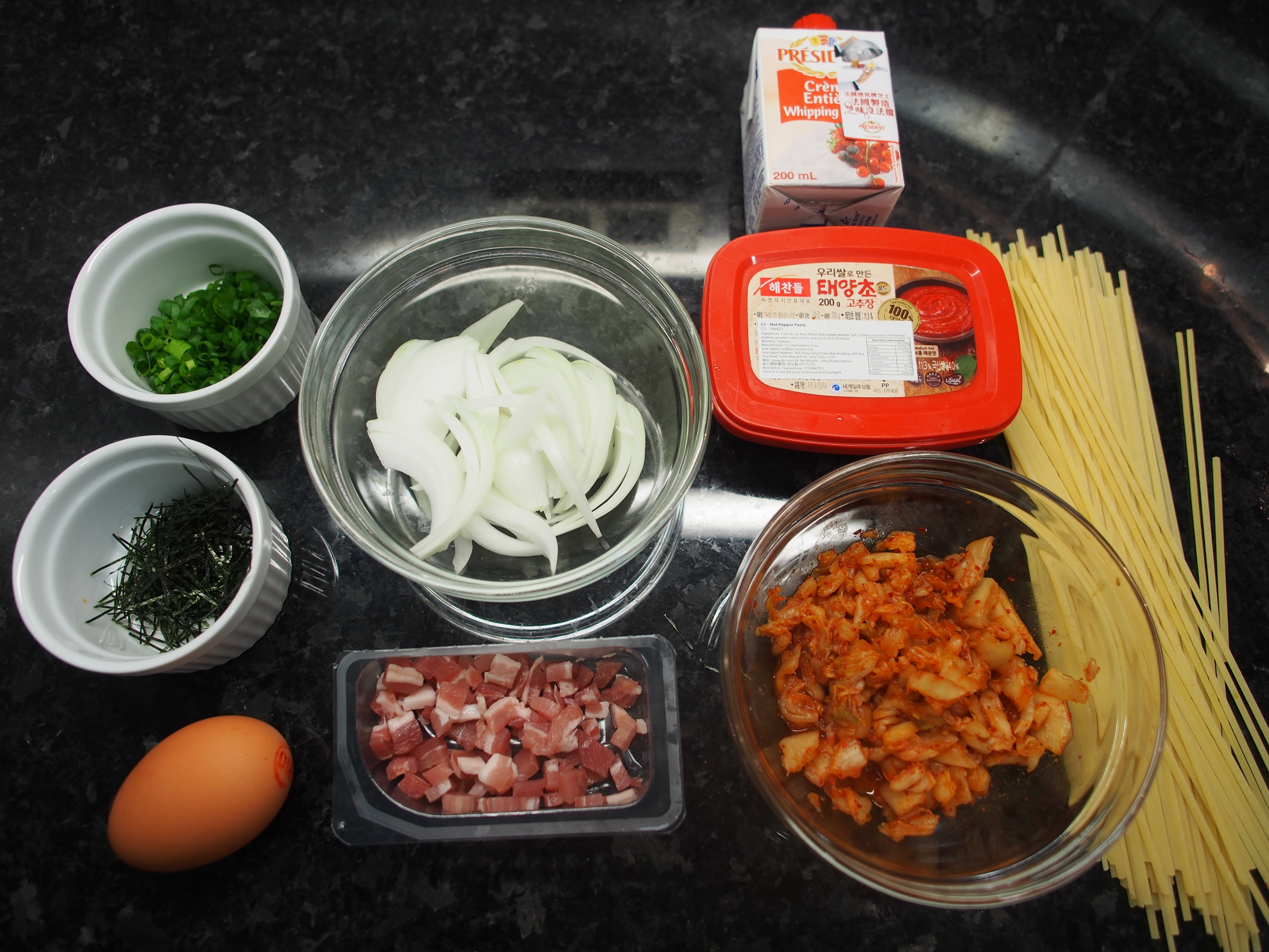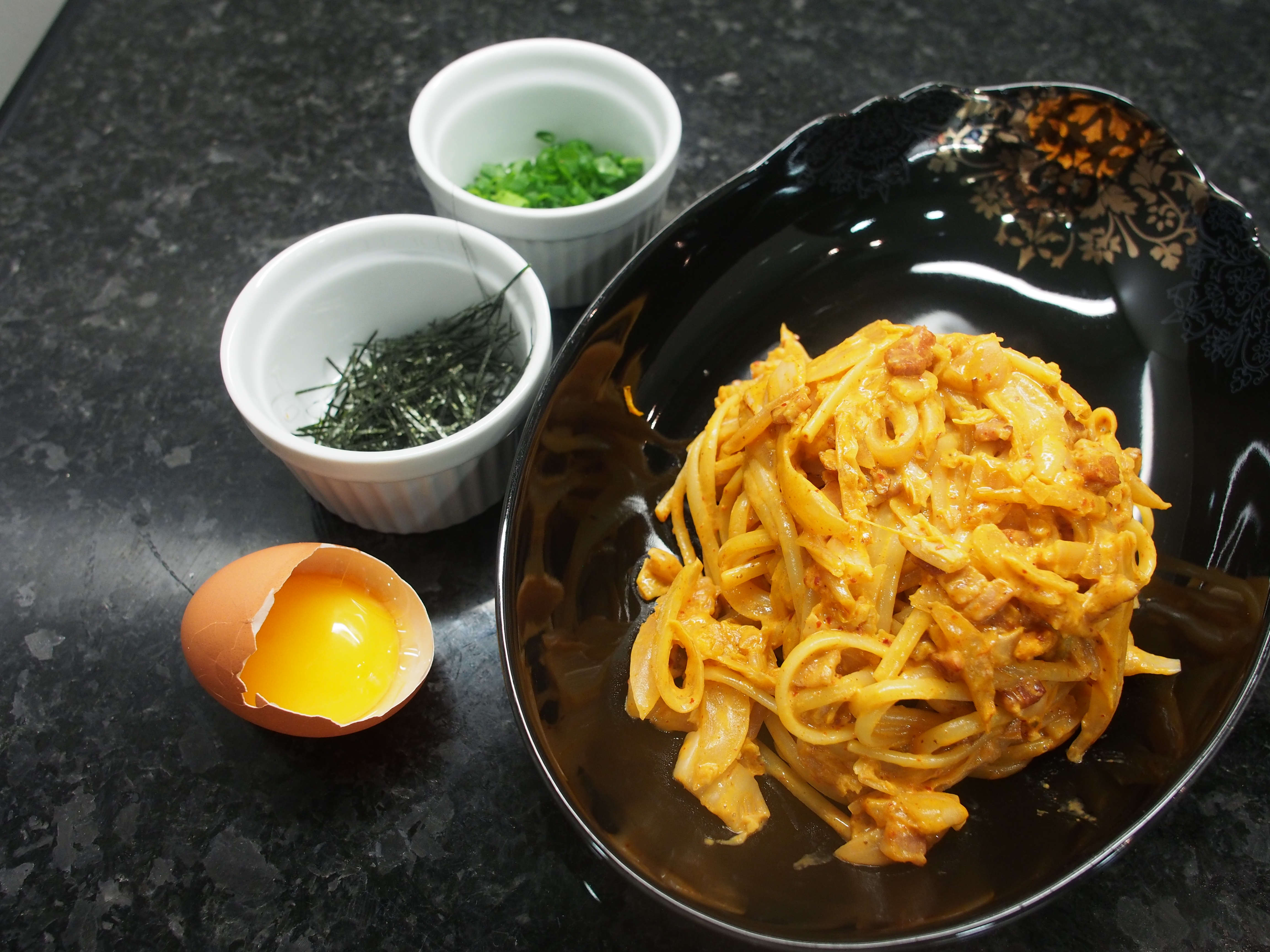 Quick, easy, and delicious!  This recipe is exactly that.  You can whip this up in well under 30 minutes and with a bit of garnishing, no one would guess how easy this was!  Recently I have gotten into a fusion kick.  Carbonara linguine is one of my favourite pastas so I wanted to give it an Asian twist by adding kimchi.  Kimchi is so versatile, it balances the creaminess of carbonara by adding some acidity and spiciness.  The kimchi and onions are still crunchy and give the dish extra texture.  I hope you give this simple recipe a try and if you do, don’t forget to let me know! 🙂