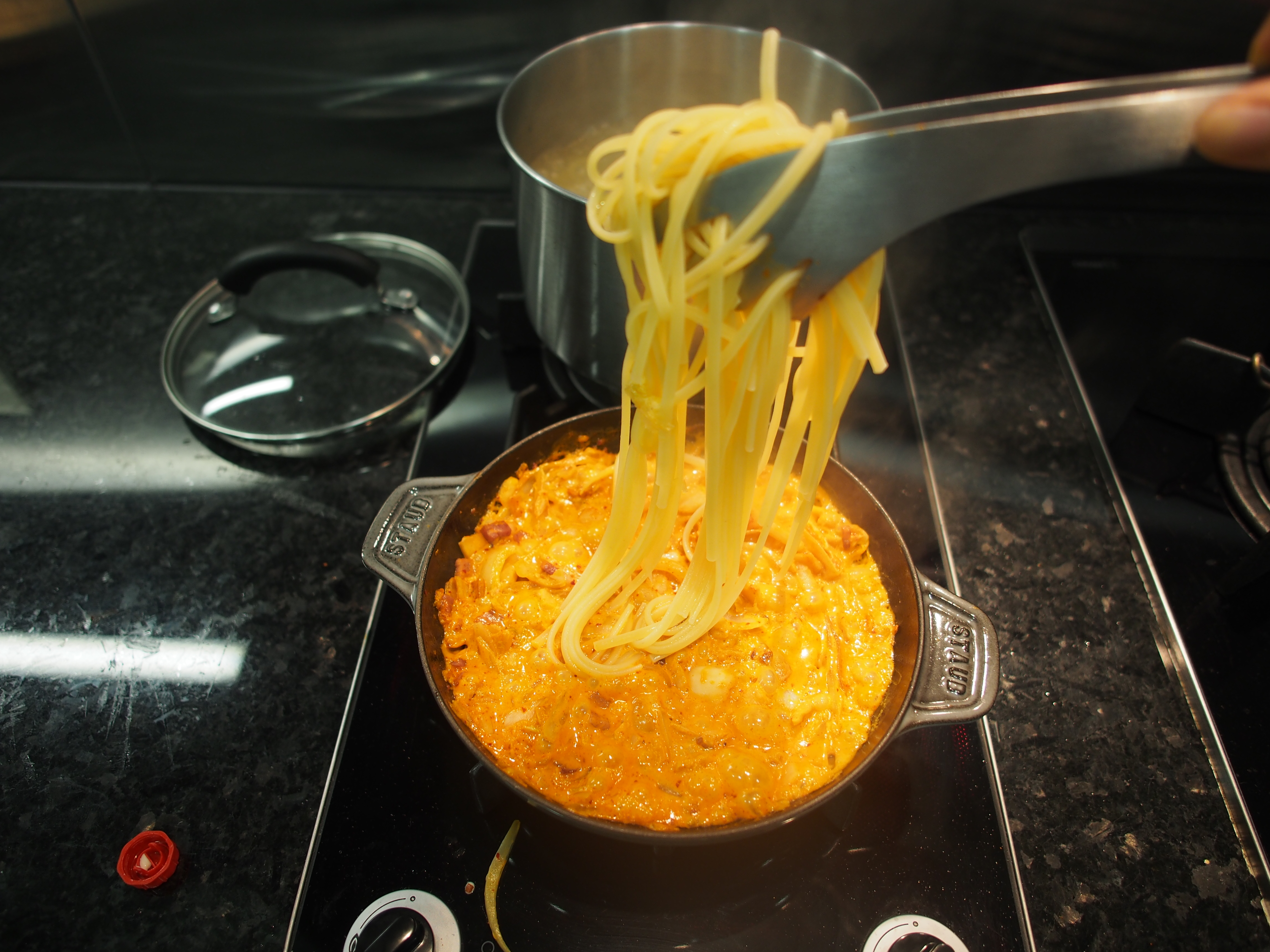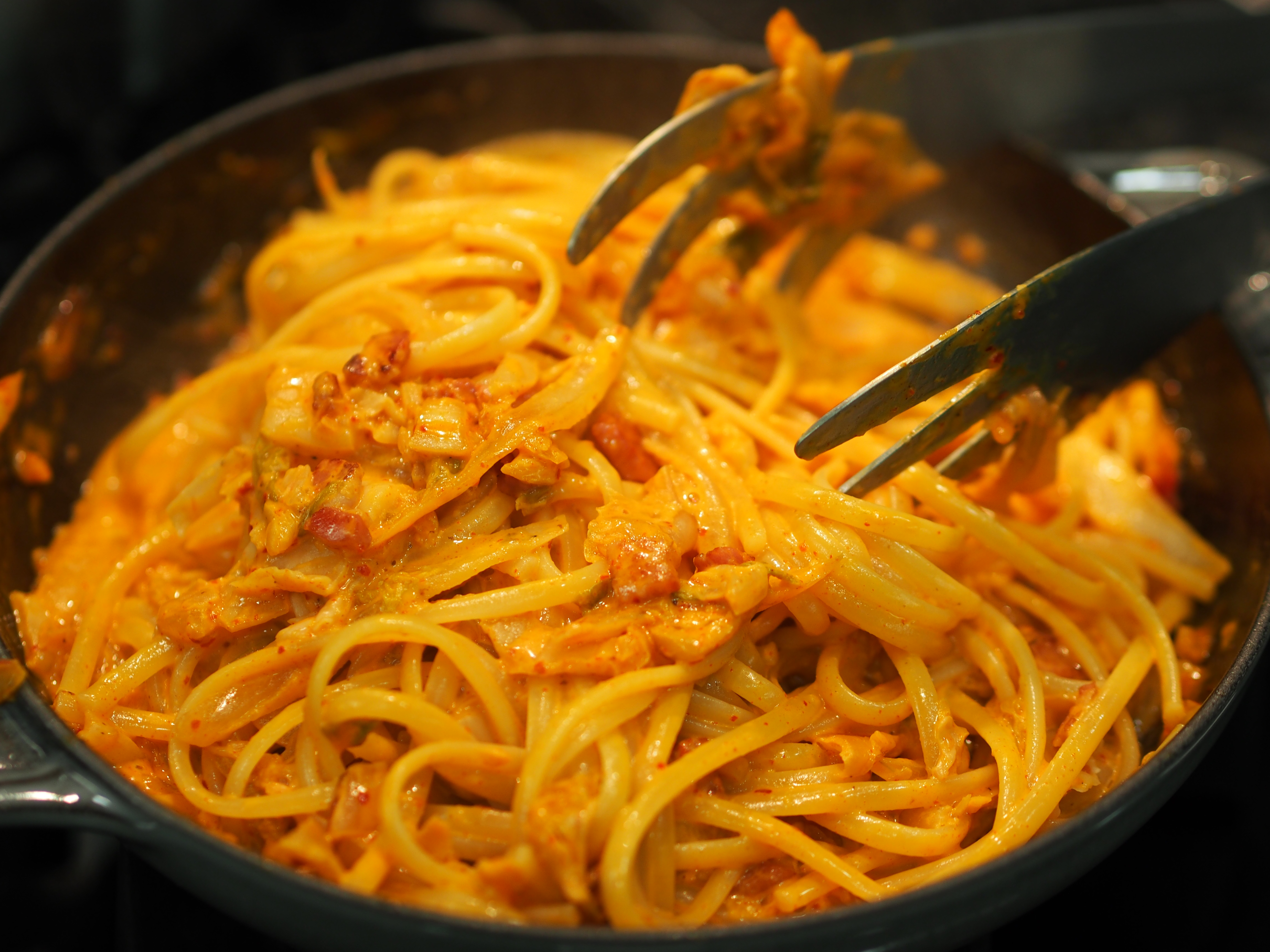 The sauce should be creamy and smooth, slightly spicy and acidic, and the kimchi and onions still a bit crunchy, and linguine al dente.