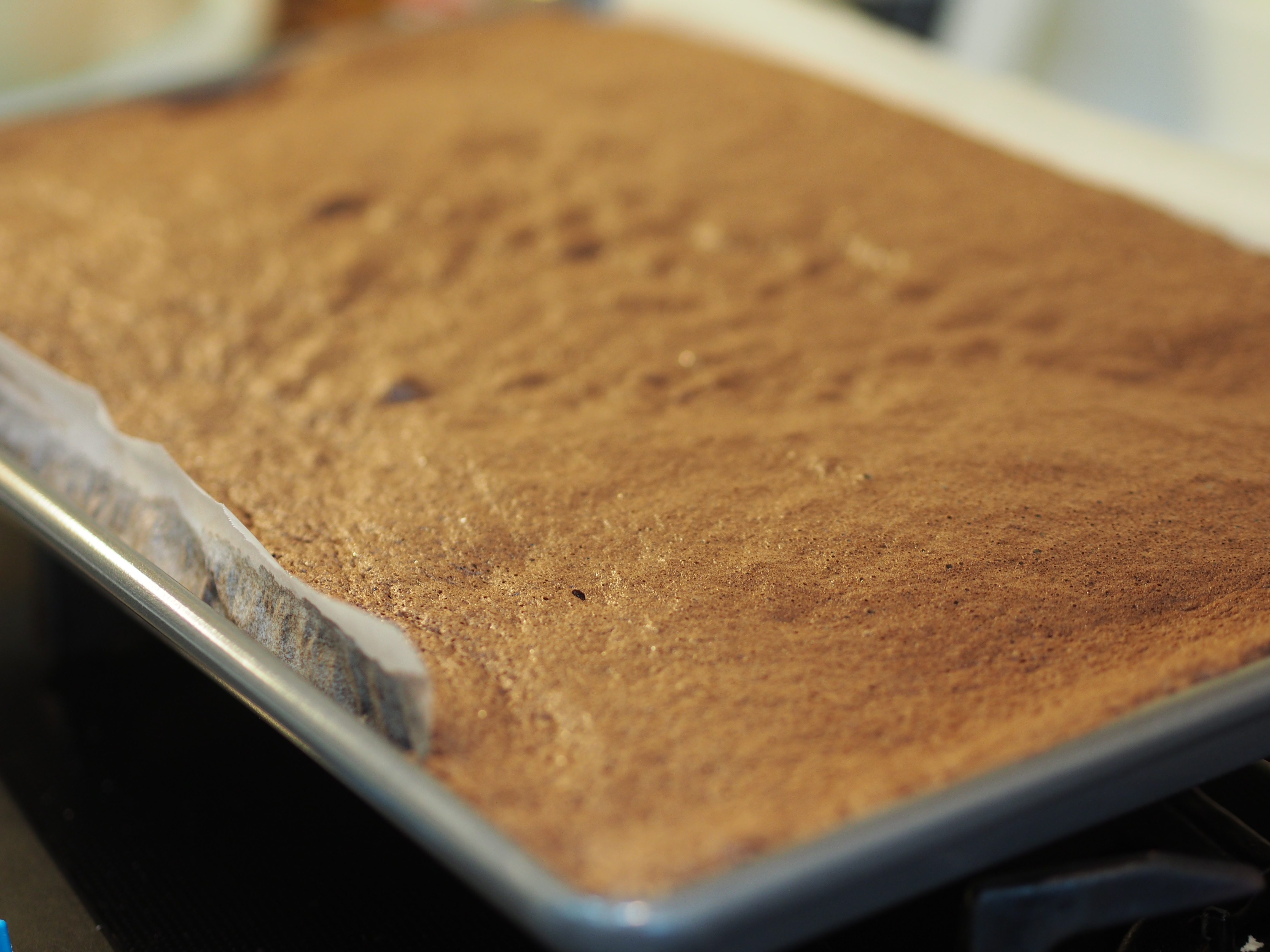 4. Line a Swiss roll tin with baking parchment, leaving a generous overhang at the ends and sides, and folding the parchment into the corners to help the paper stay anchored.