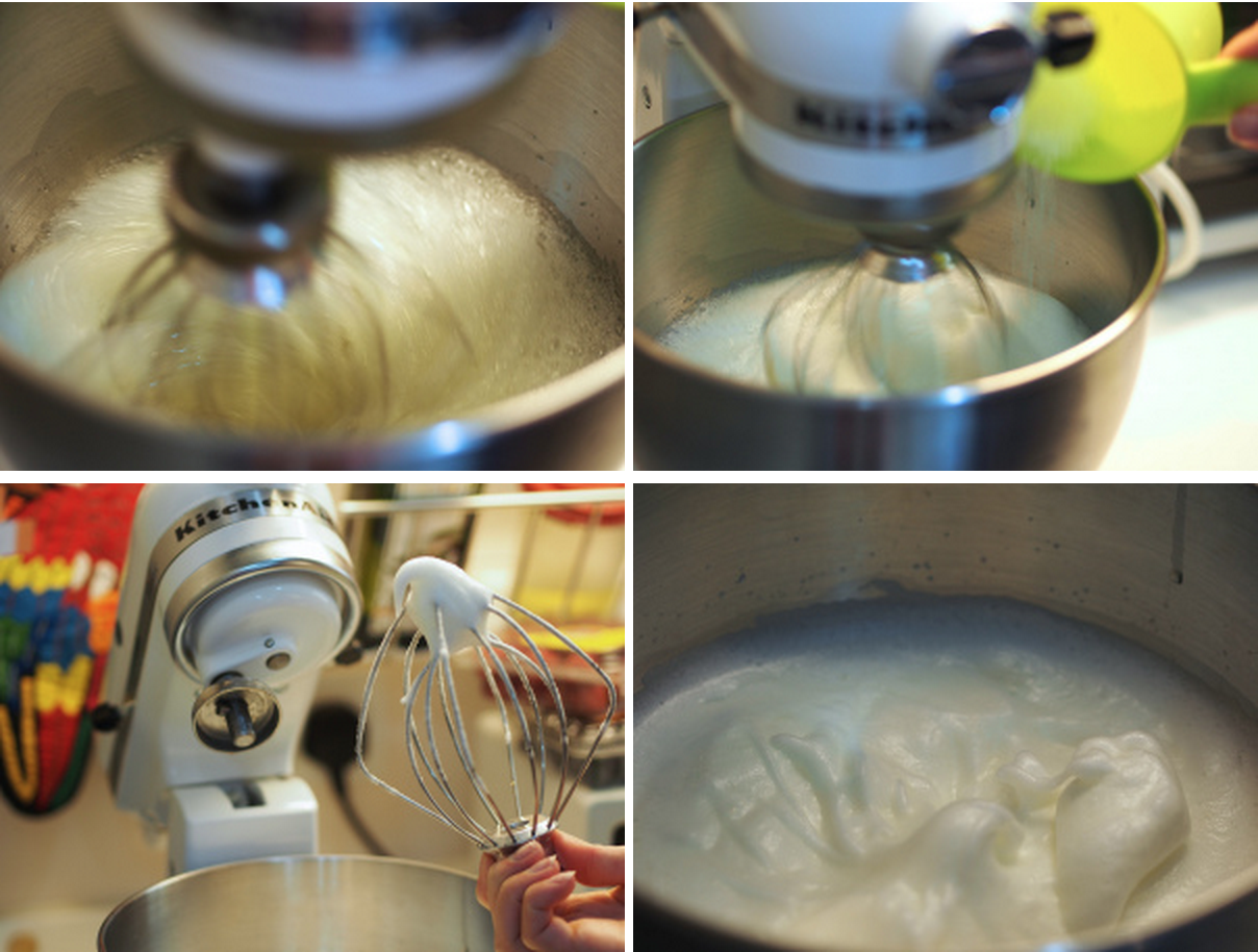 1. In a large, clean bowl whisk the egg whites until thick and peaking, then, still whisking, sprinkle in 50g or 1/4 cup of the caster sugar and continue whisking until you achieve soft to medium peaks