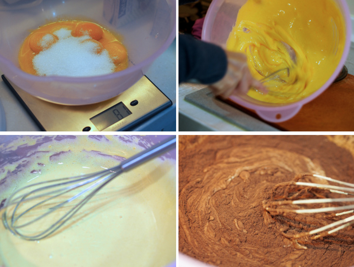 2. In another bowl, whisk the egg yolks and the remaining caster sugar until the mixture is moussy, pale and thick. Add the vanilla extract, sieve the cocoa powder over, then fold both in.