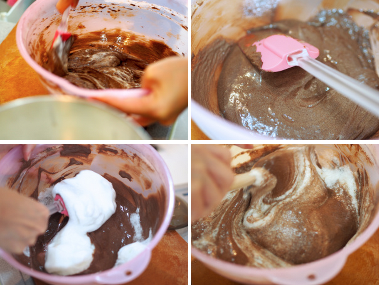 3. Lighten the yolk mixture with 1/3 of the egg whites (mix thoroughly without worrying about losing the air). Then, add the remaining whites in thirds, folding them in carefully to avoid losing the air.