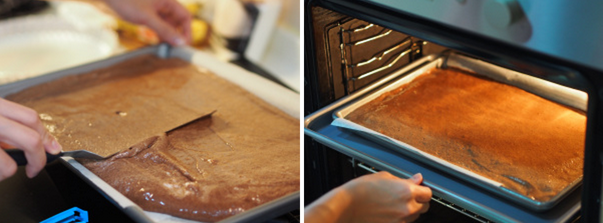 Pour in the cake mixture and bake in the oven at 180 C for 20 minutes. Let the cake cool a little before turning it out onto another piece of baking parchment.