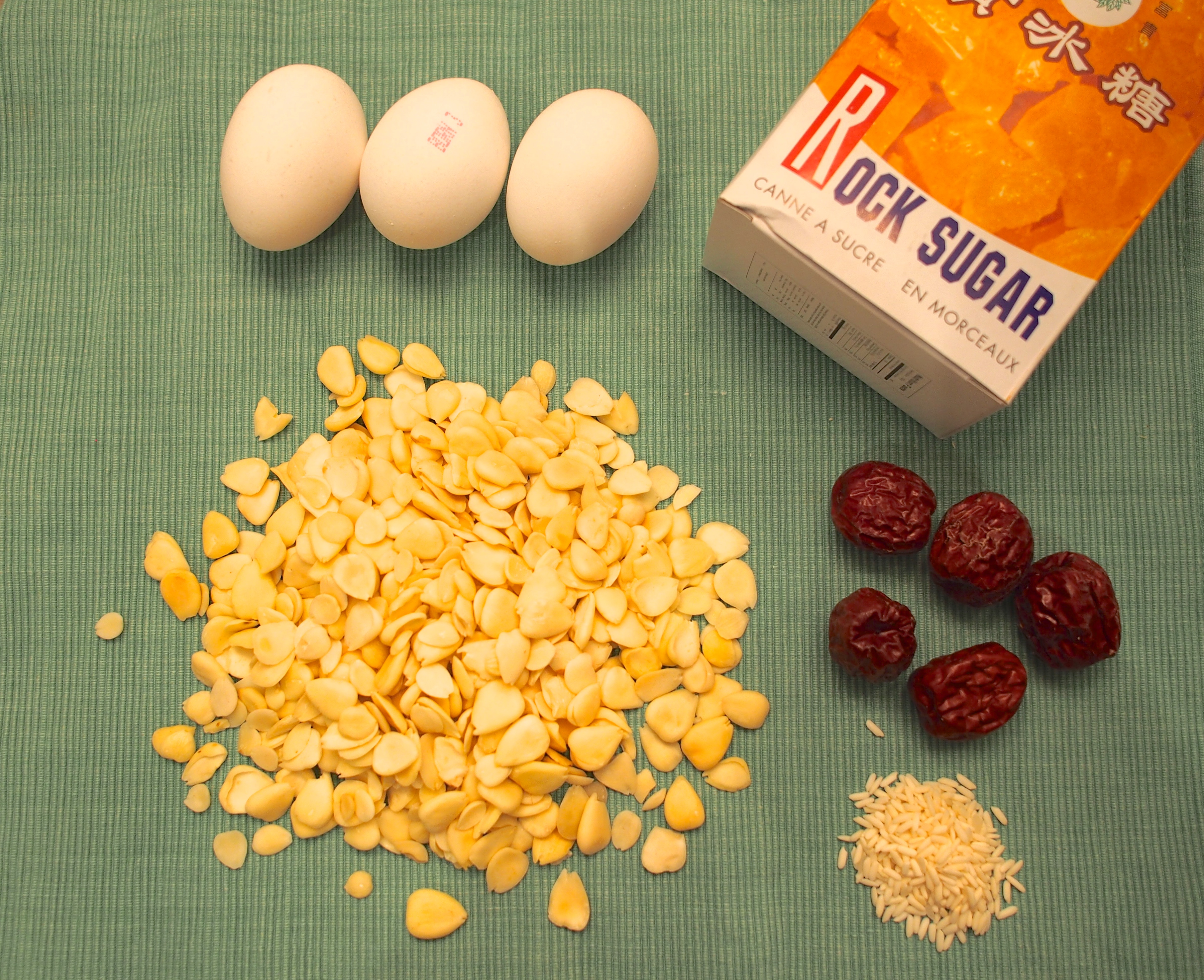 We’ve used two types of Chinese almonds called sweet almonds南杏 and bitter almonds北杏. Sweet almonds are larger and functionally quite similar to the western almonds we commonly find in super stores. On the other hand, because of their bitter taste and mild toxicity, bitter almonds cannot be eaten raw and are usually only used in Chinese medicine to clear and nourish the lungs and intestines. Now don’t worry, once you soak and boil the bitter almonds, it is safe to consume. Because of these properties, the best balanced ratio (in weight) is 4 sweet almonds 南杏 to 1 bitter almond北杏. Lastly, we added some glutinous rice to make the almond tea thicker and creamier. You can also use regular western almonds instead- left unpeeled will have extra fibers but will colour the tea.