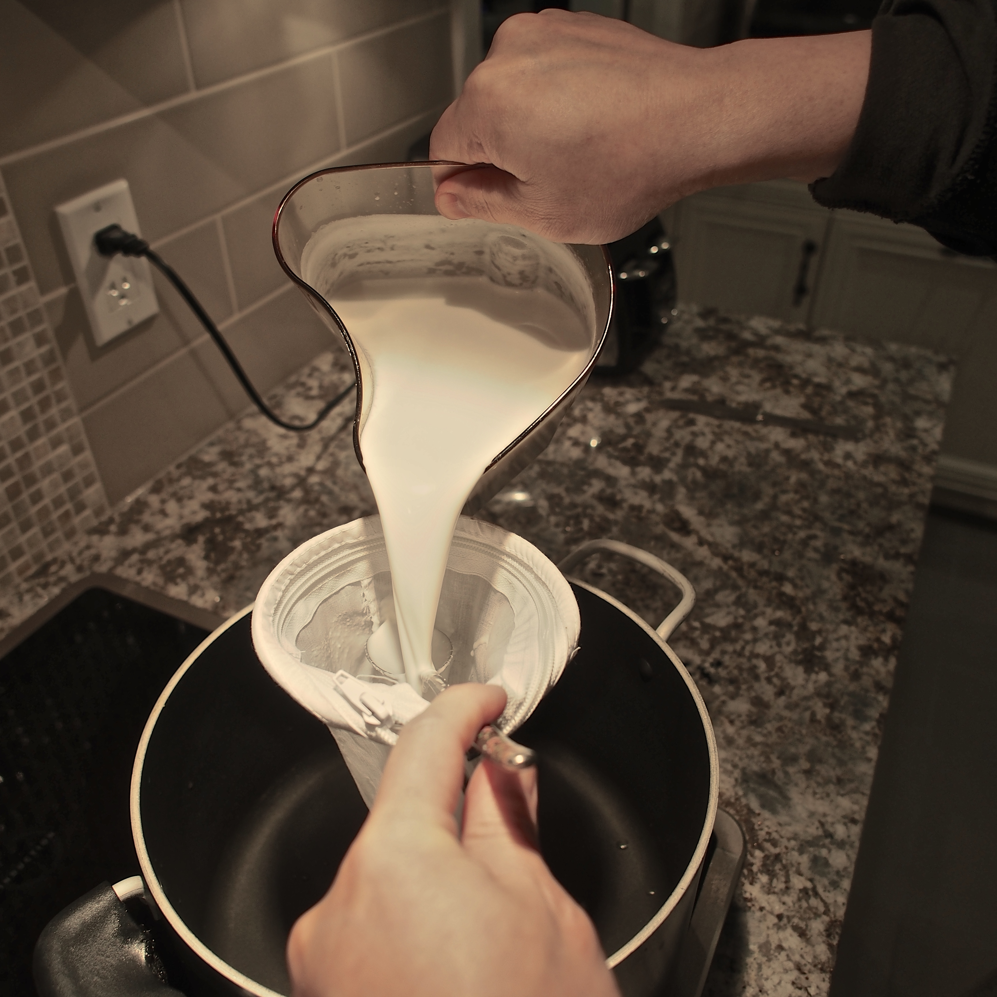 *Try to find a large cloth coffee/tea filter bag with very tight mesh rather than small coffee filters so you don’t need to pour little by little.