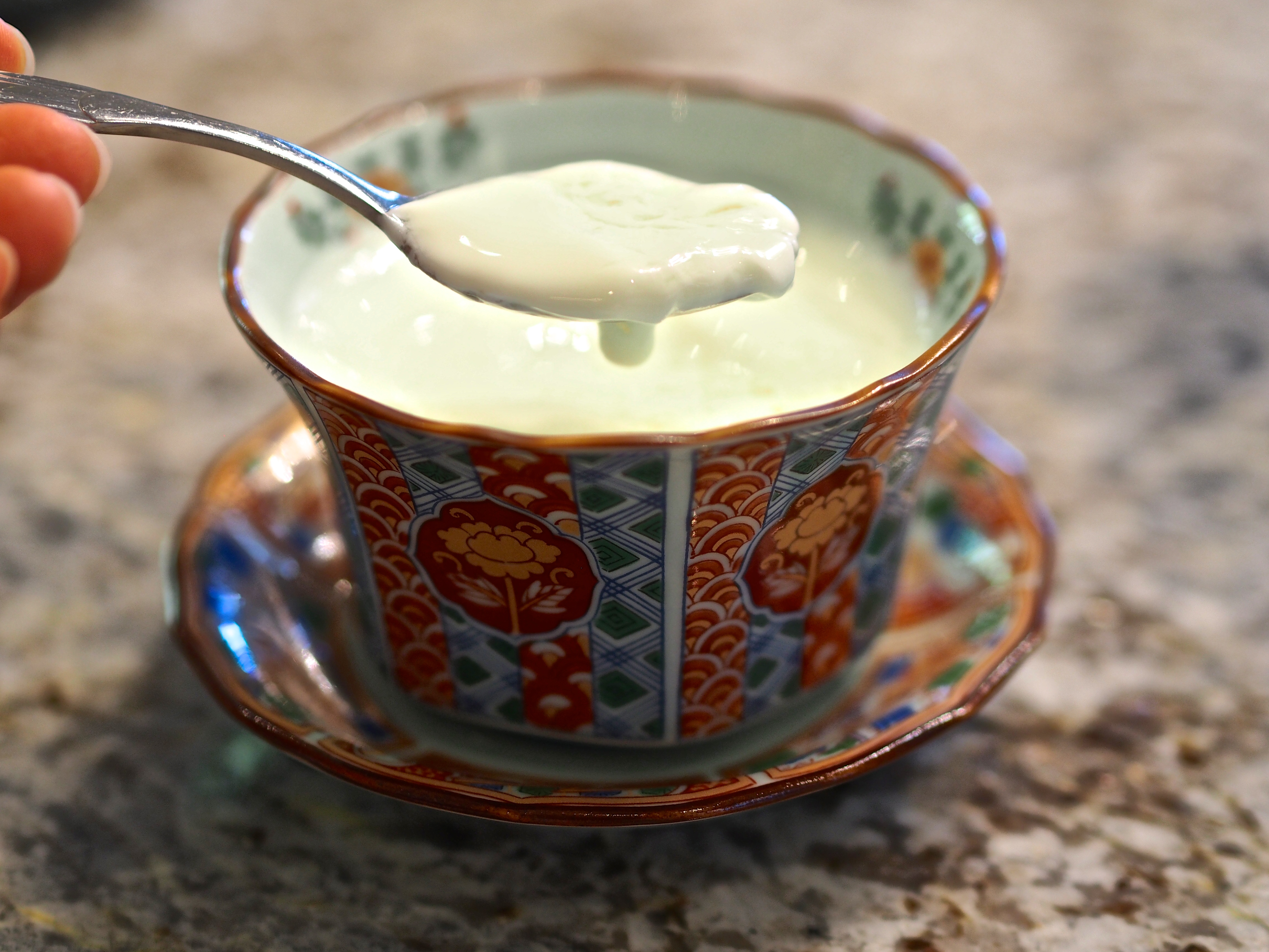 6. After 10 minutes, it should look like there is a film on top. Gently shake to see if it has set to a very loose consistency (even softer than tofu pudding). The ultimate test is to place a spoon on top and if it stays up, it is ready! If it’s not ready, let it sit for 5 more minutes- if it still hasn’t set after 15 minutes it likely won’t, so just enjoy it as a drink!