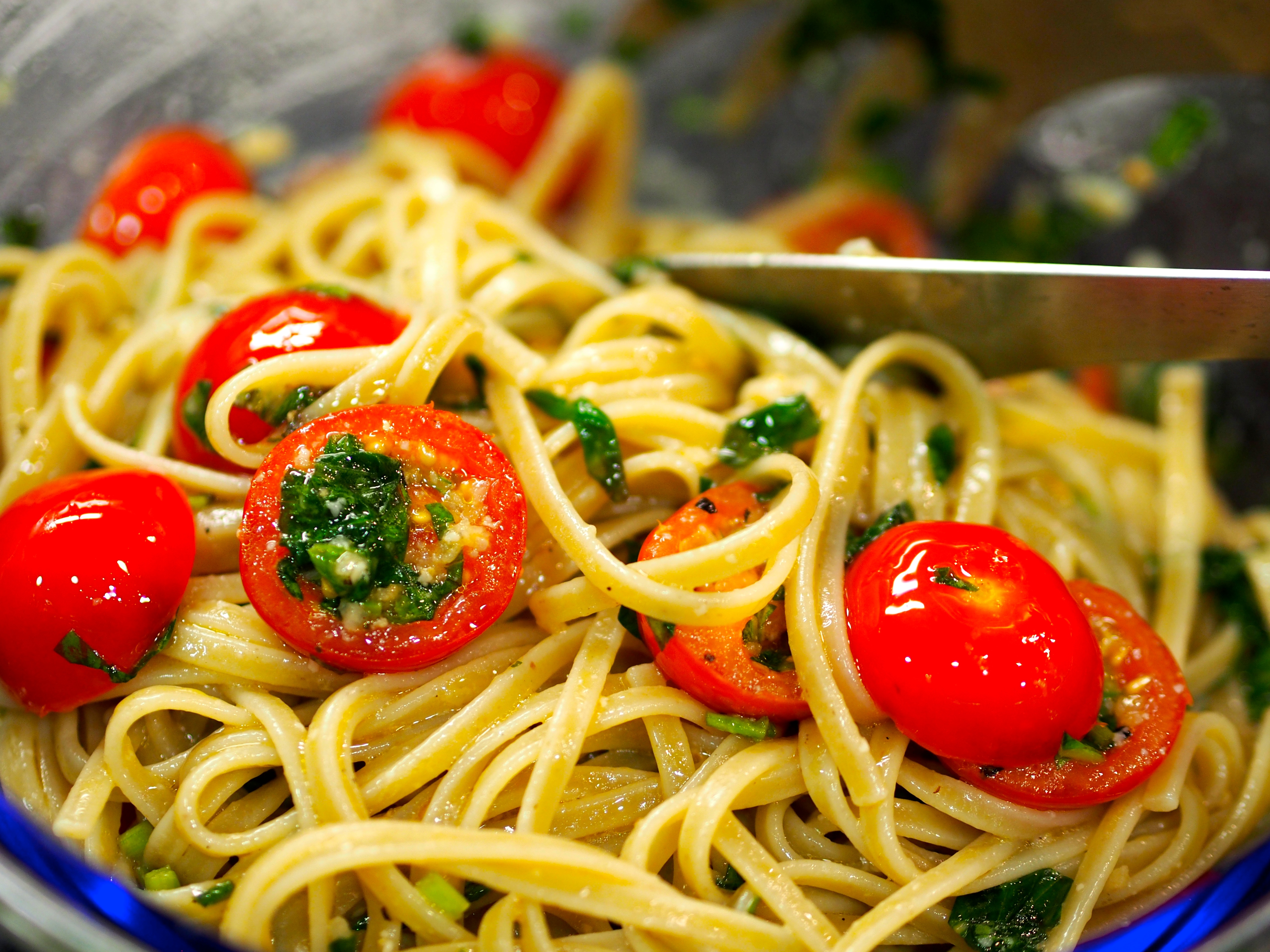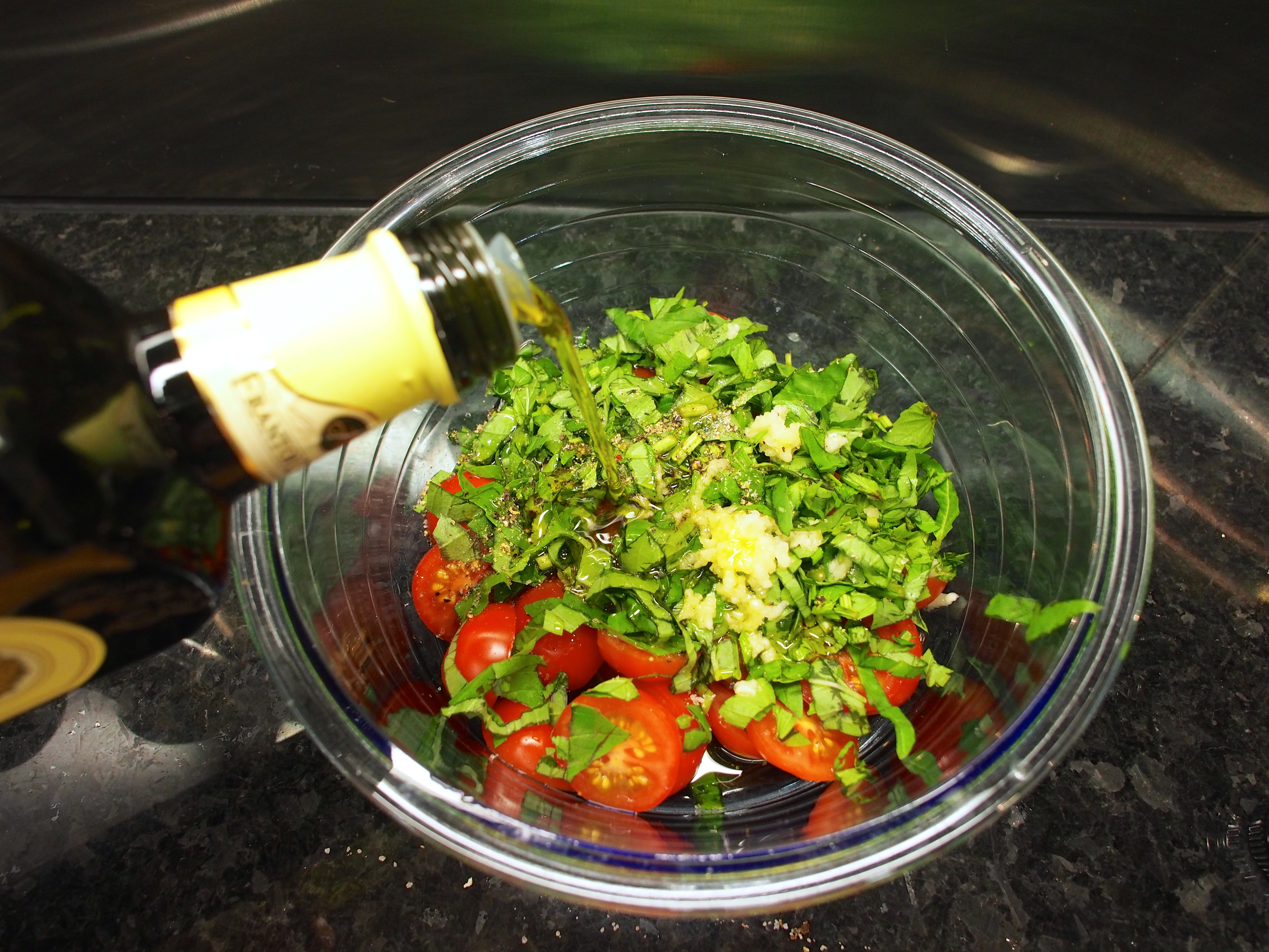 *let it sit for as long as the pasta cooks to let the garlic/tomato juices/basil/parmesan infuse into the oil