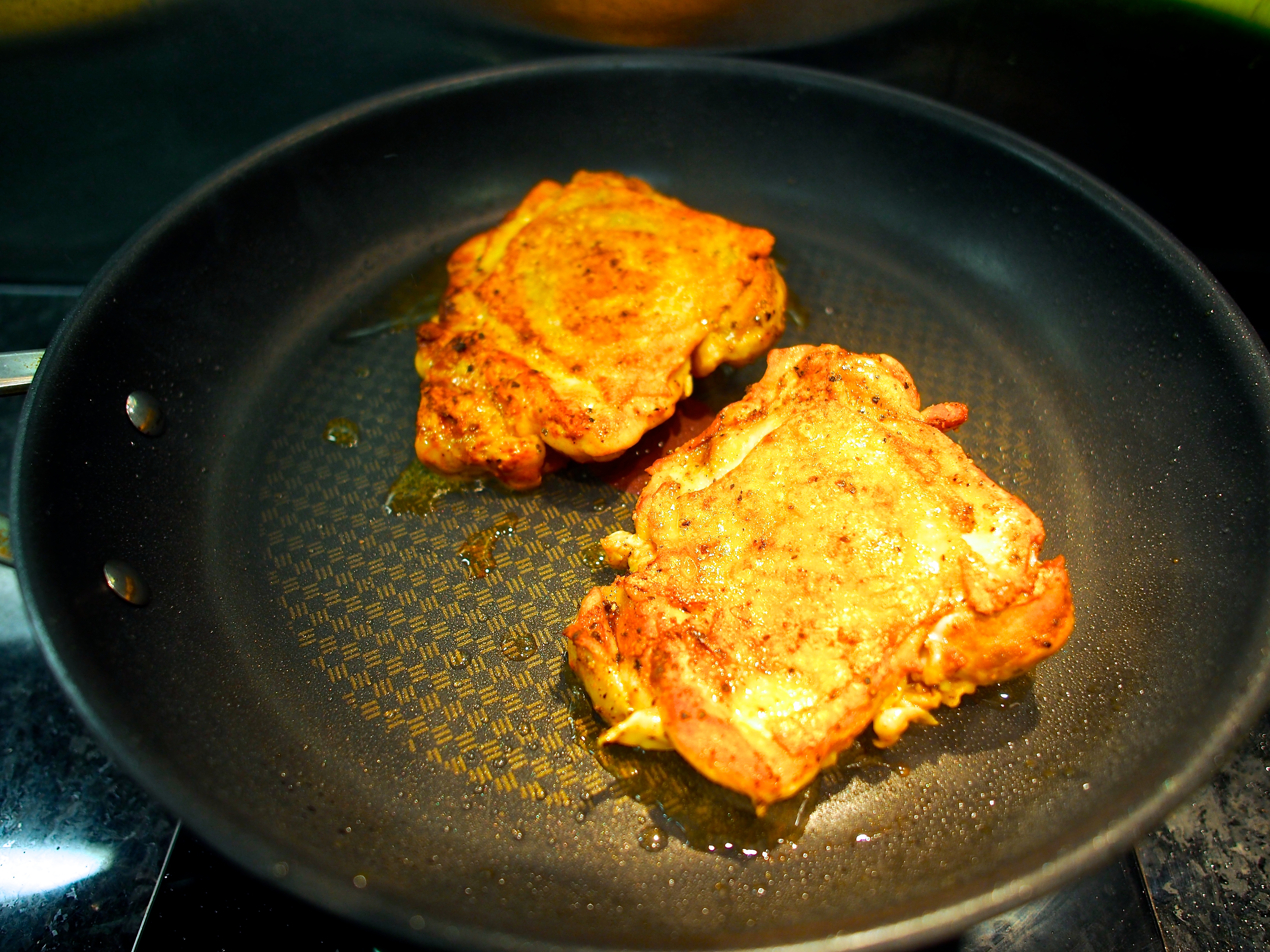 3. Heat regular olive oil on med-high heat and place the chicken skin side down into the hot oil to give it a nice golden sear.