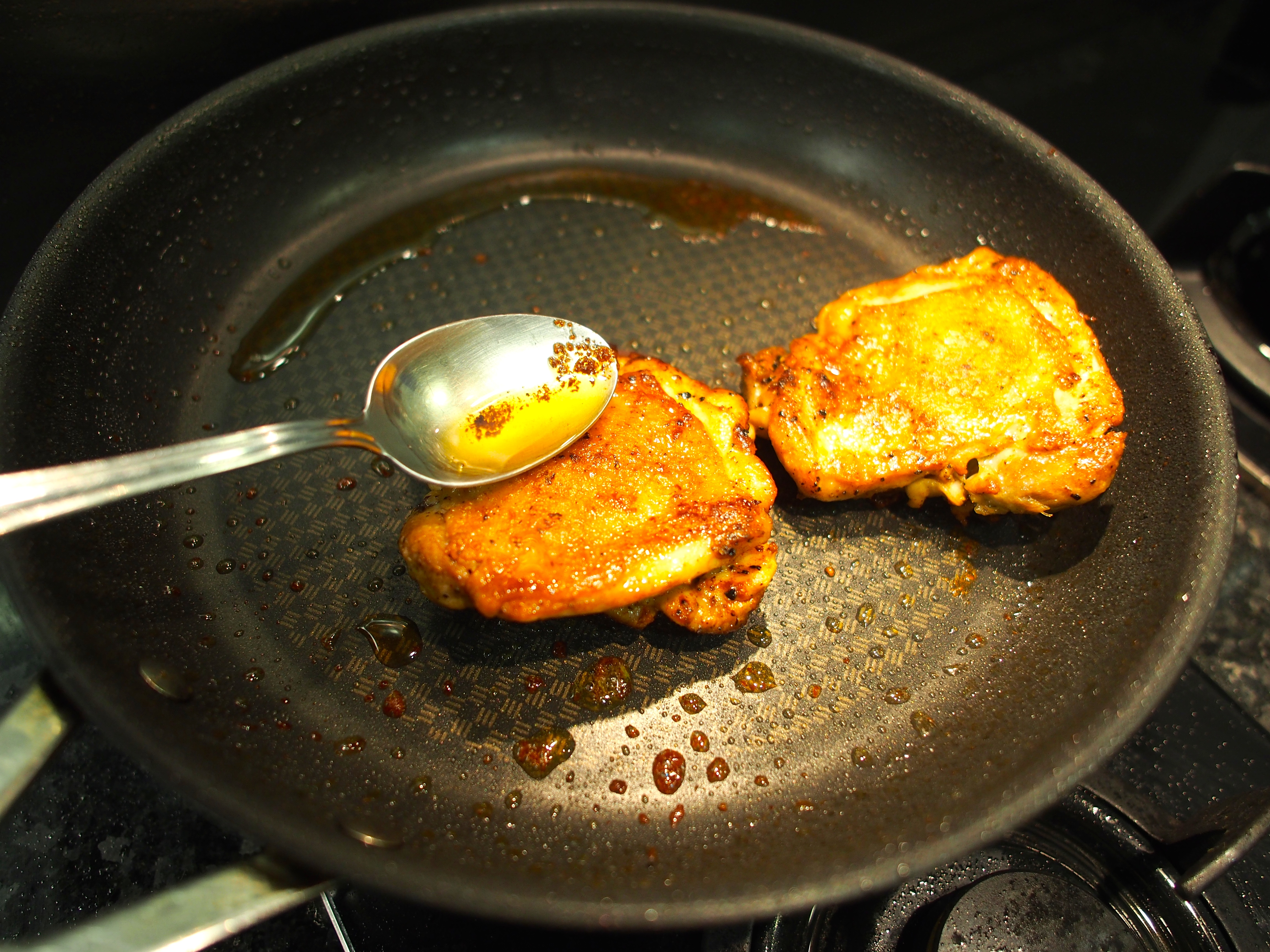 4. Once both sides are golden, with the skin side up, add some boiling water into the pan (thin layer at bottom of pan) and partially cover with a lid, turn down the heat to med-low and cook for about 8-10 minutes or until fully cooking (no pink juices running out).