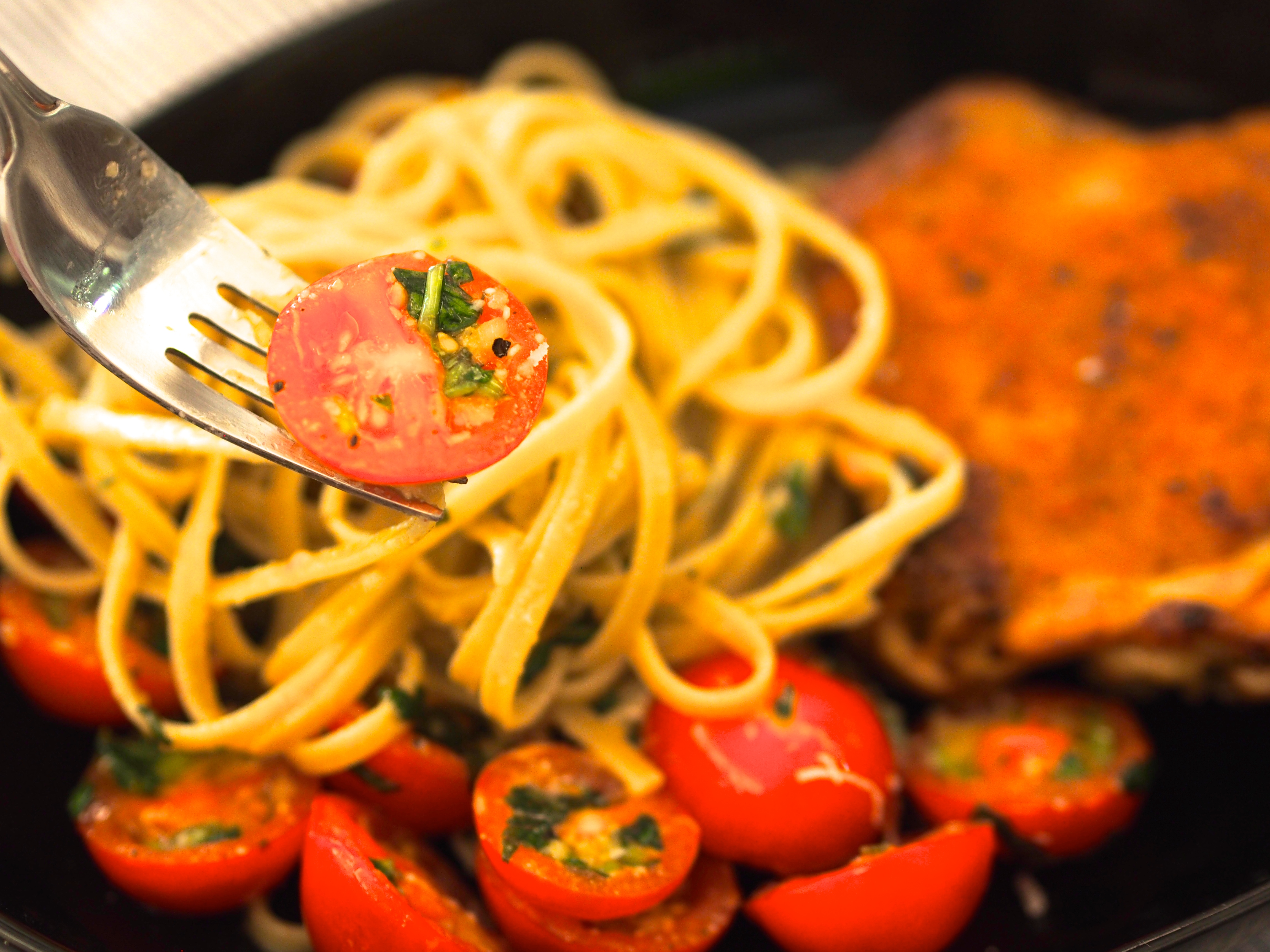 Tomatoes, garlic, and basil are a trio made in heaven, I love how the slight tartness of the tomatoes goes so well with spiciness of garlic and fragrance of basil leaves. These three ingredients pretty much sum up the feeling of summer for me – light, fresh, and bright! I love this pasta to accompany any meats (steak, lamb, chicken etc) because it doesn’t distract away from the rich flavours of the meat. It is light and you can just taste each individual fresh ingredient; each cherry tomato is like a little pocket bursting with vibrant flavour. The longer you let it sit together the more infused their flavours get into the olive oil. Recently I have been working on perfecting my pan-seared chicken thigh and I think I’ve got the perfect tricks down for a flavourful and moist chicken with a crispy skin. Bosco said it tastes so good he almost doesn’t believe it was homemade because it almost tastes like fast food chicken! So this is like two small recipes in one- this simple pasta and the perfect cooked chicken thigh, great on their own or together for a healthy and light meal!